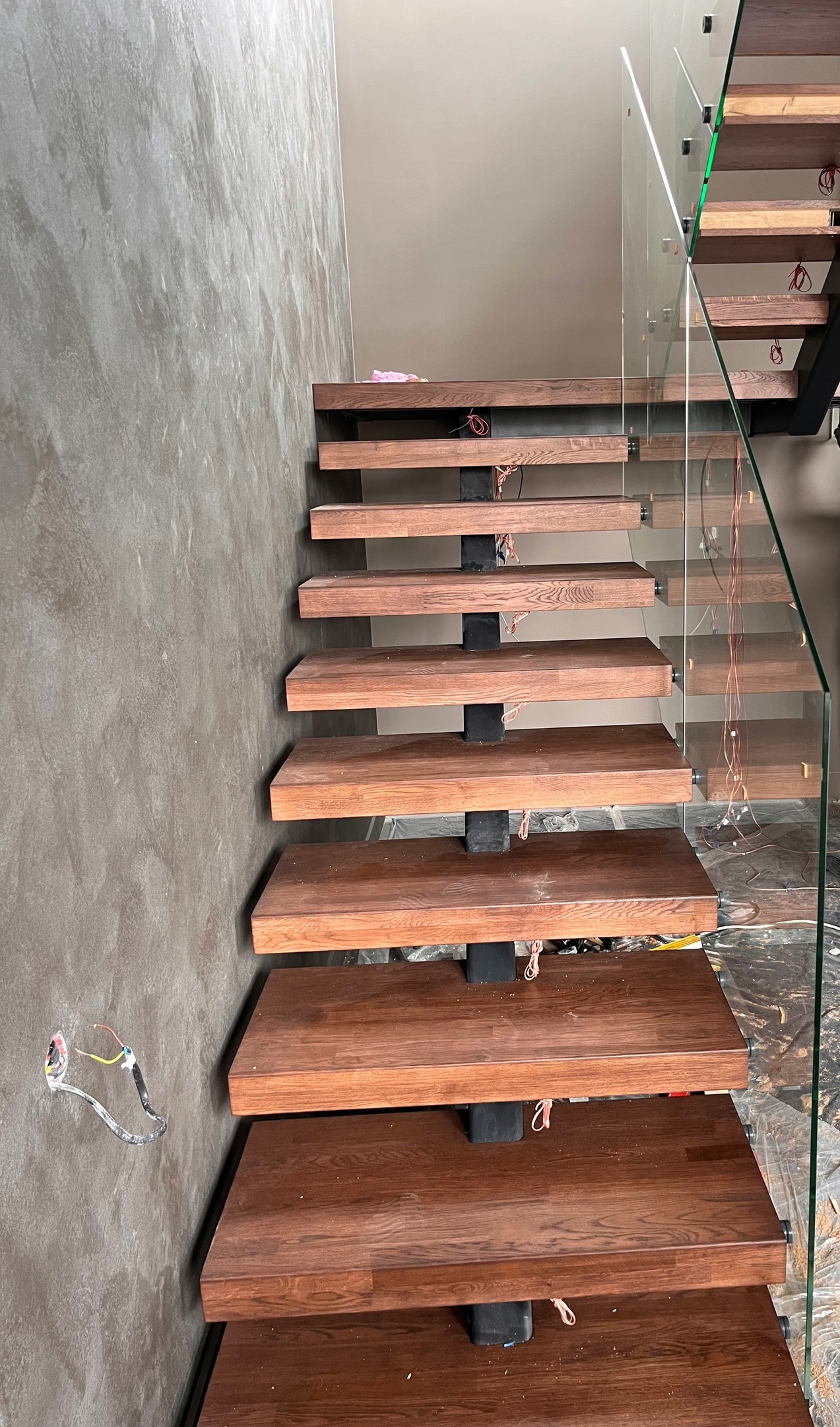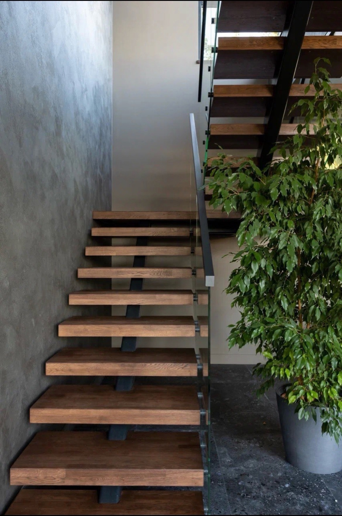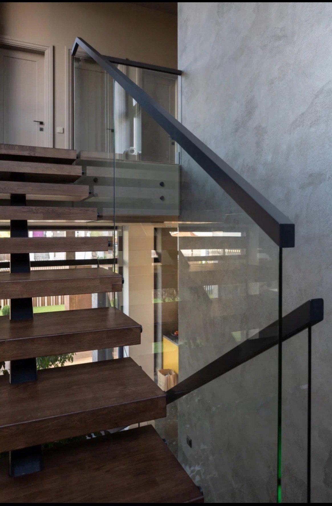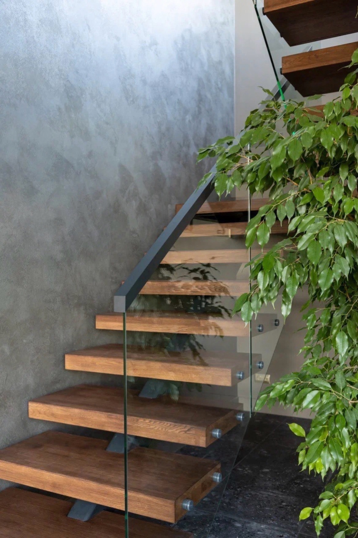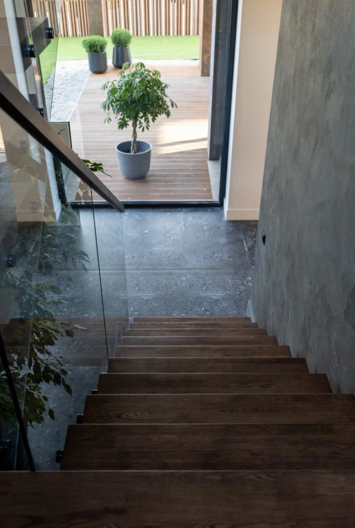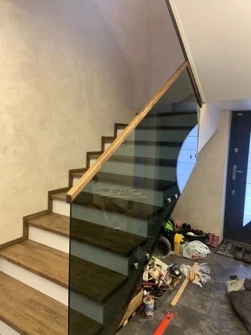Облицовка бетонной лестницы со стеклянным ограждением